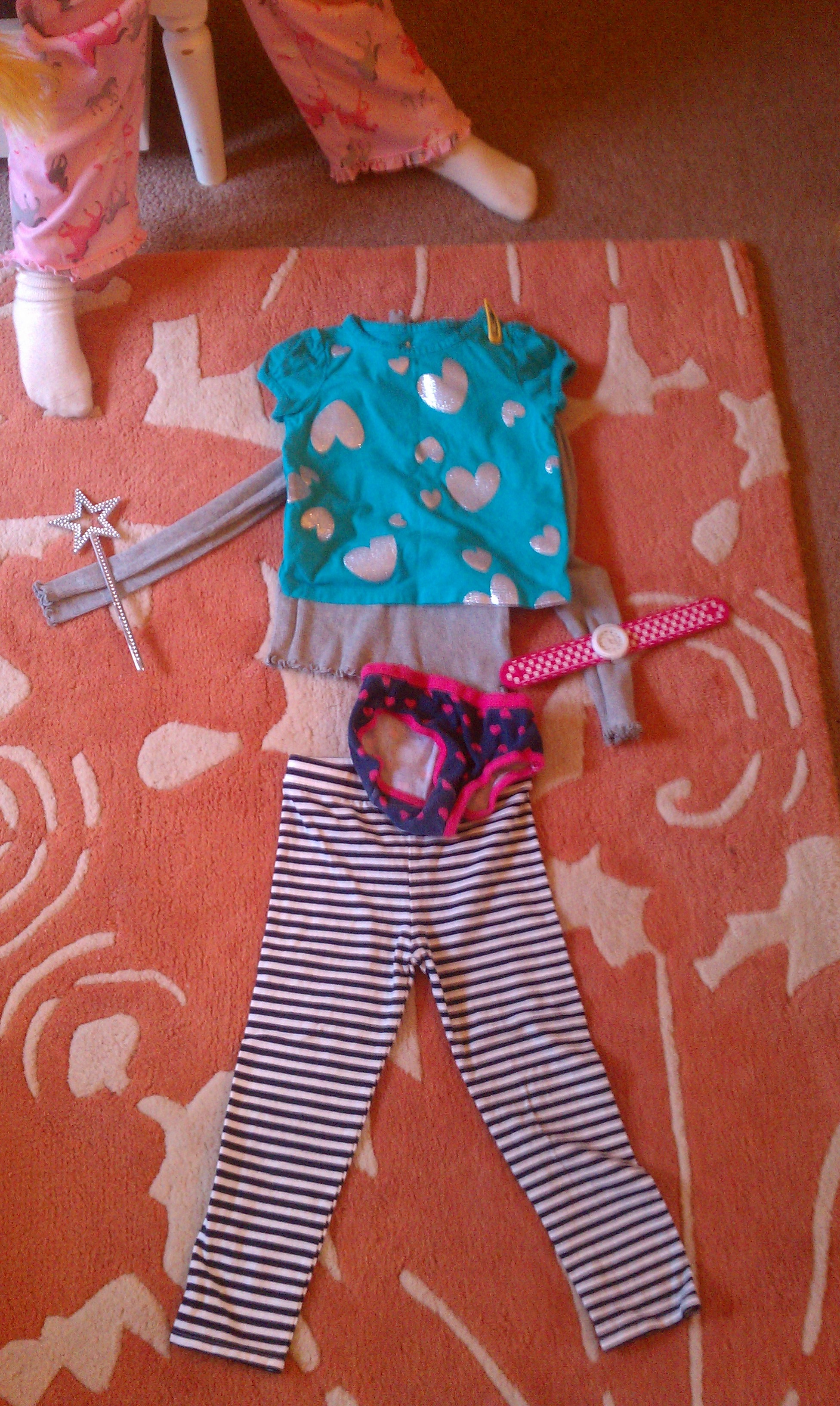Ada laid out her clothes today. We call her “Clothes-Ada”. She wanted to do it herself. When she called me in, this is what I found. Not a bad combo. I laughed noting the nice touches. The accessories were the best: a watch, a wand, and a hair clip (look upper right). Ada and clothes-Ada are ready to go. We love you Ada.
